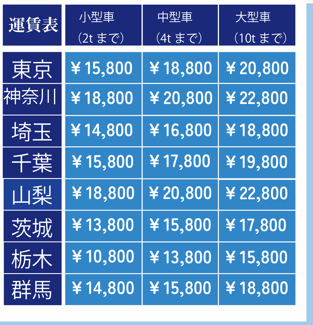 関東中心での輸送となりますが、対応エリアと車両サイズによってご料金が変動いたしますので、詳細については料金表と合わせてお問合せ下さい。